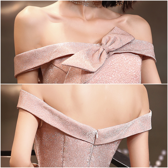 ロールカラーにリボンを結んだ、上品リッチなイブニングドレス。