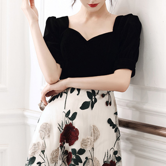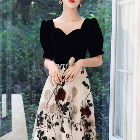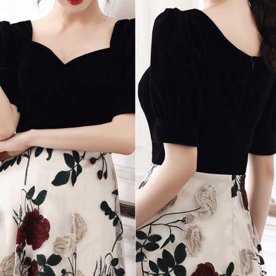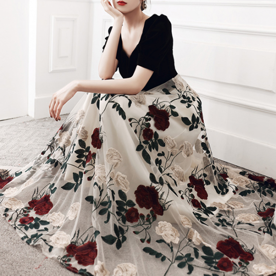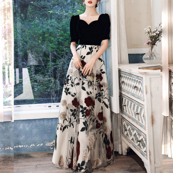 ドレス 異素材 薔薇柄 ロング ハートネック ランタンスリーブ 大人フェミニン 映える 結婚式 二次会 お呼ばれ