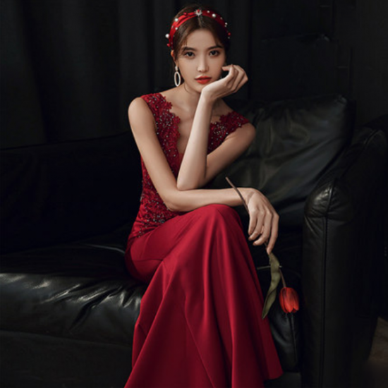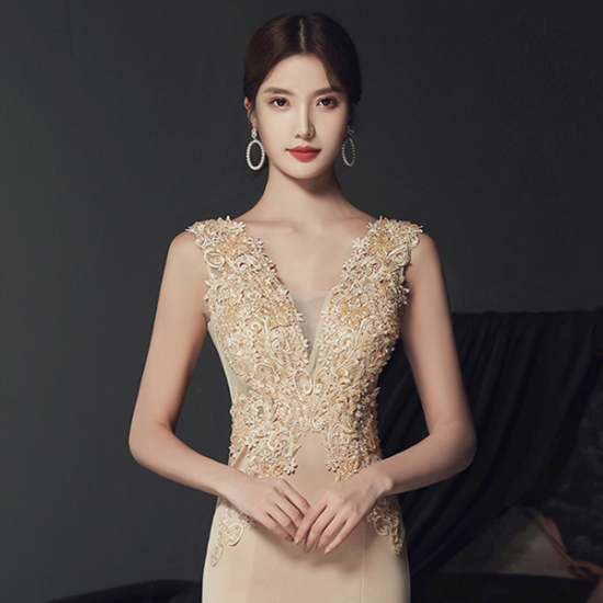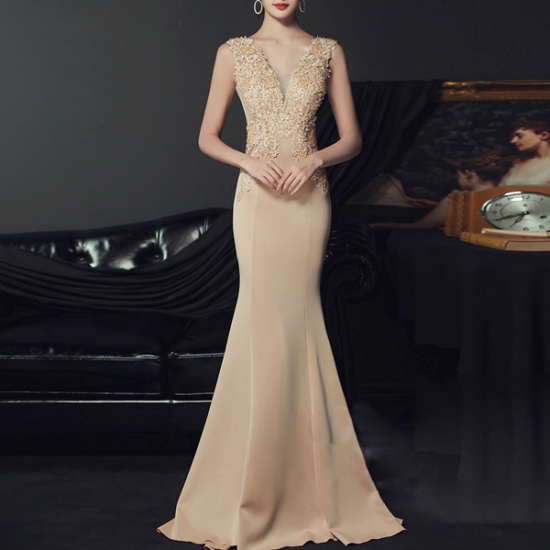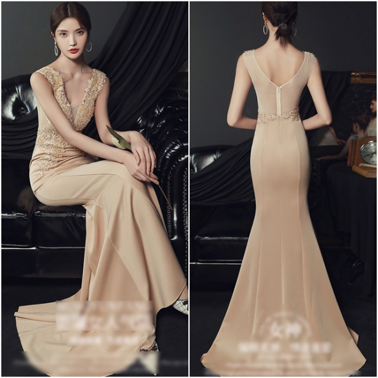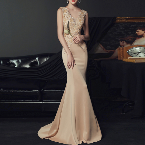 女神のようなマーメイドラインがセンシュアルなイブニングドレス。