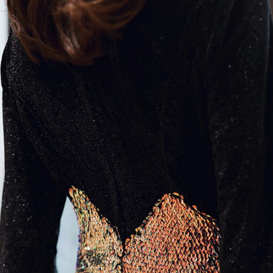 ゴールドのスパンコールを敷き詰めたスカートはインパクト抜群。