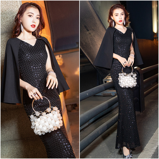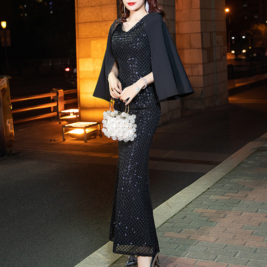 ドレス 都会的 マーメイド スパンコール 斜め格子 ケープスリーブ ロング丈 女らしさ 品格 夜会 ドレッシー 結婚式 二次会 お呼ばれ