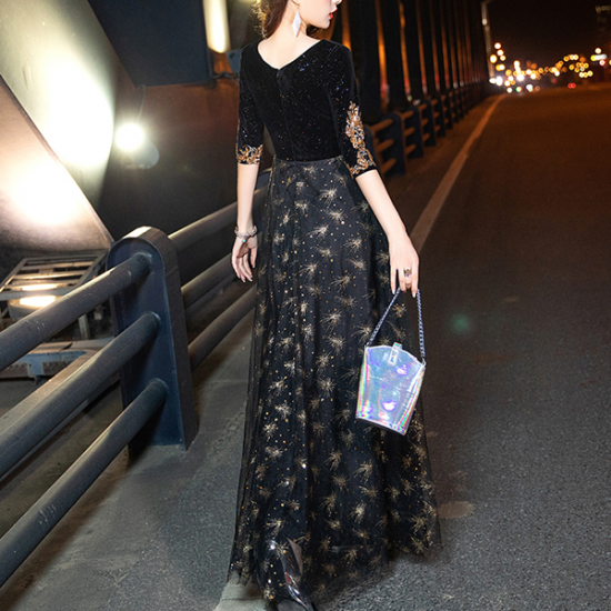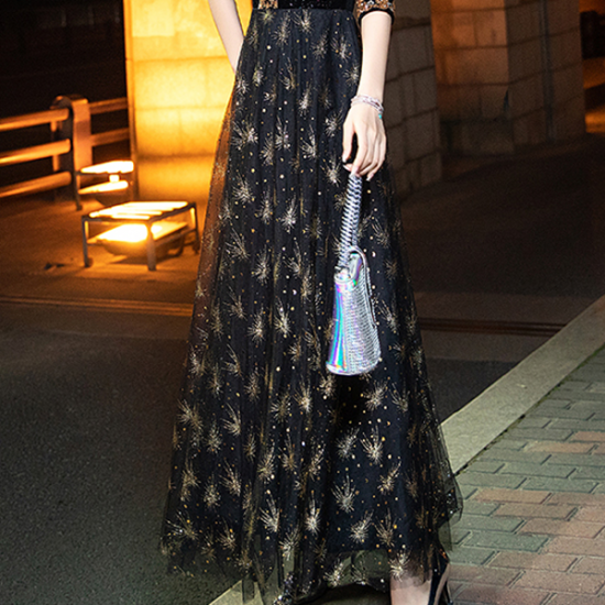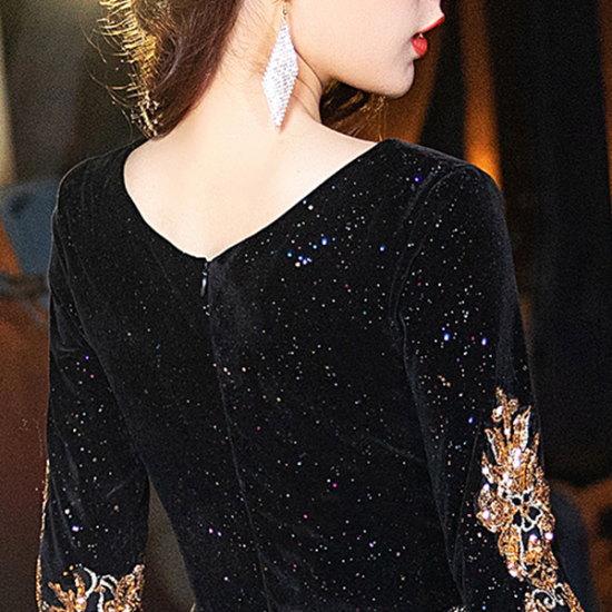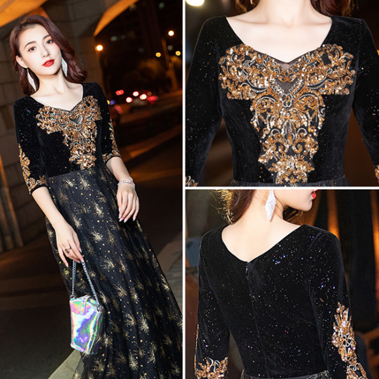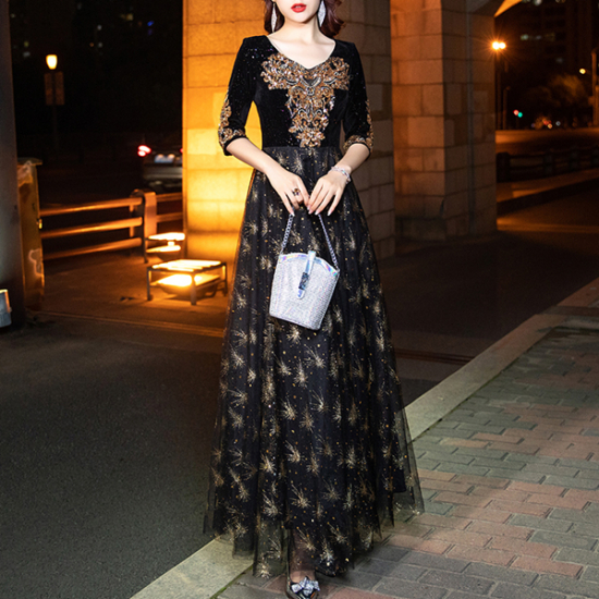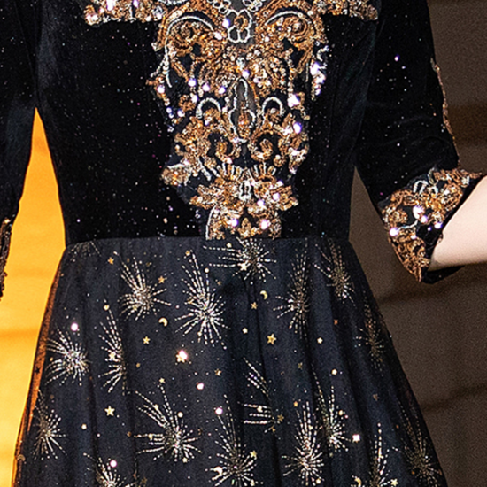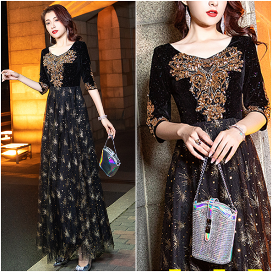 ドレス ヨーロピアン シック ブラック×ゴールド ベルベット ラグジュアリー 刺繍 箔プリント ロングフレア 高見え フォーマル 結婚式 二次会 お呼ばれ