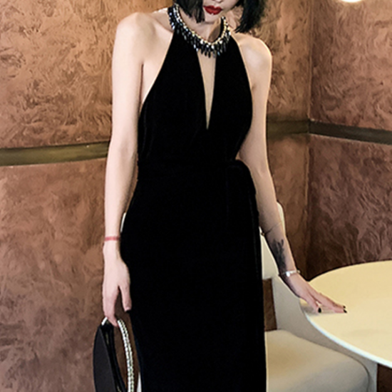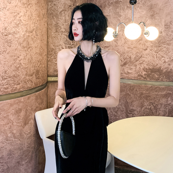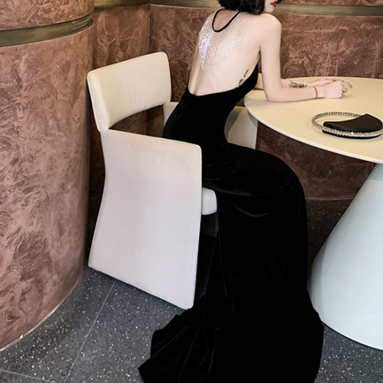 妖艶なオーラを纏い、曲線美をアピールするブラックイブニングドレス。