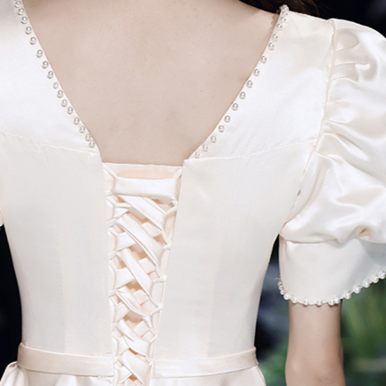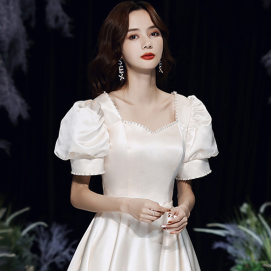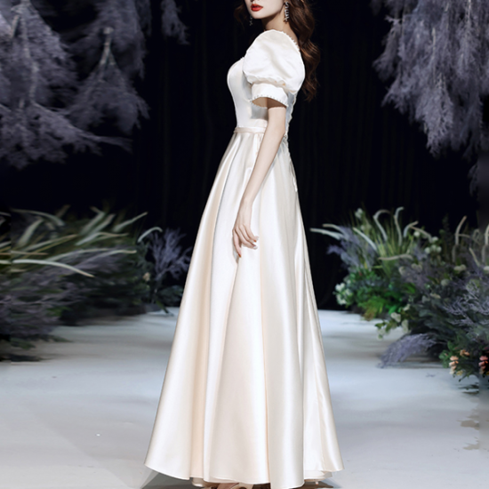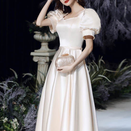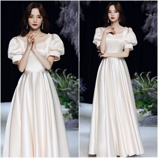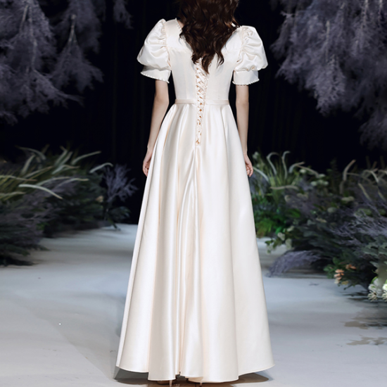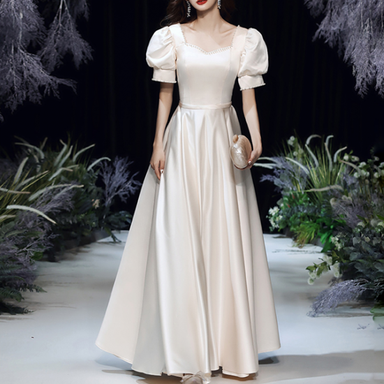 ドレス サテン 光沢 高貴 Aライン ロング ボリュームスリーブ パール 背面レースアップ クラス感 結婚式 二次会 お呼ばれ