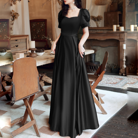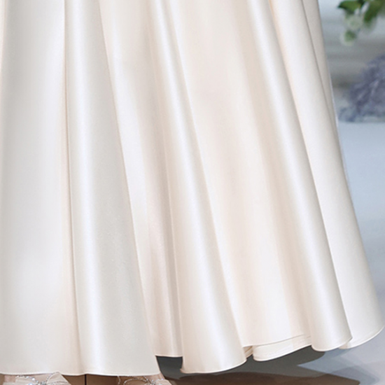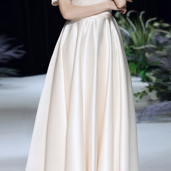 サテンのなめらかな光沢が高貴さを漂わせる、Aラインロングドレス。