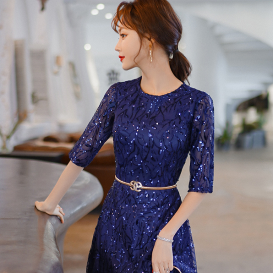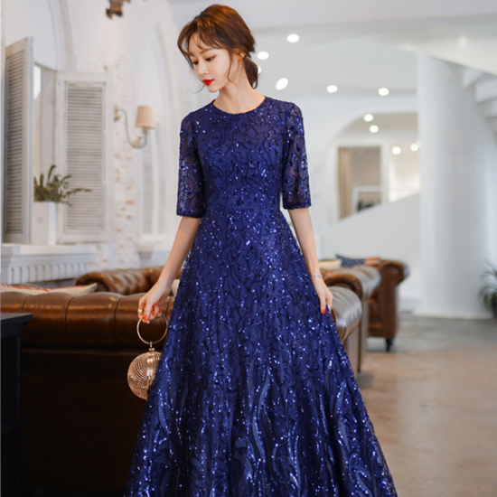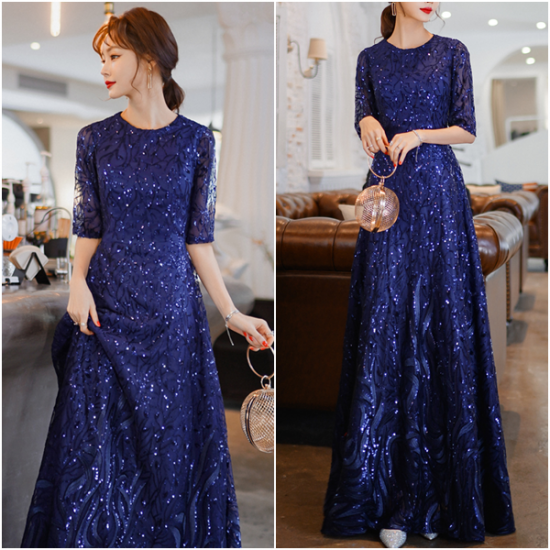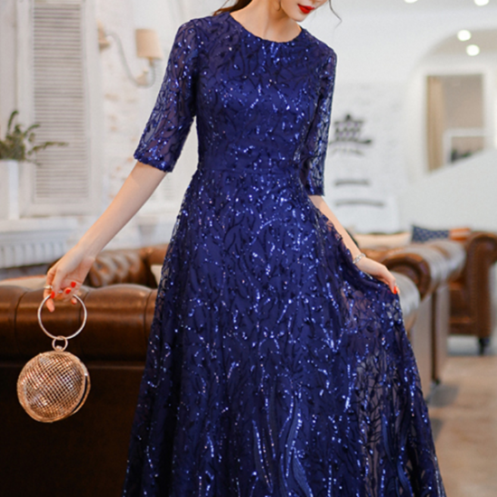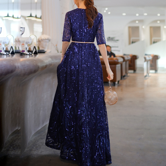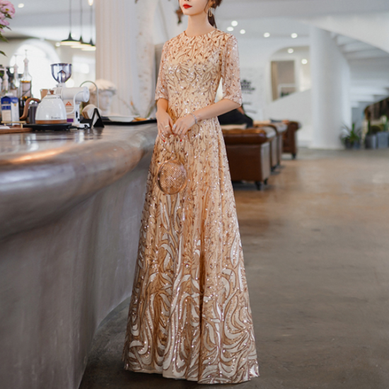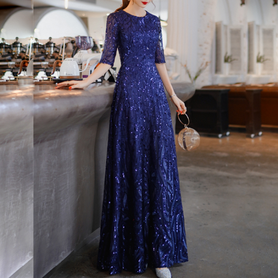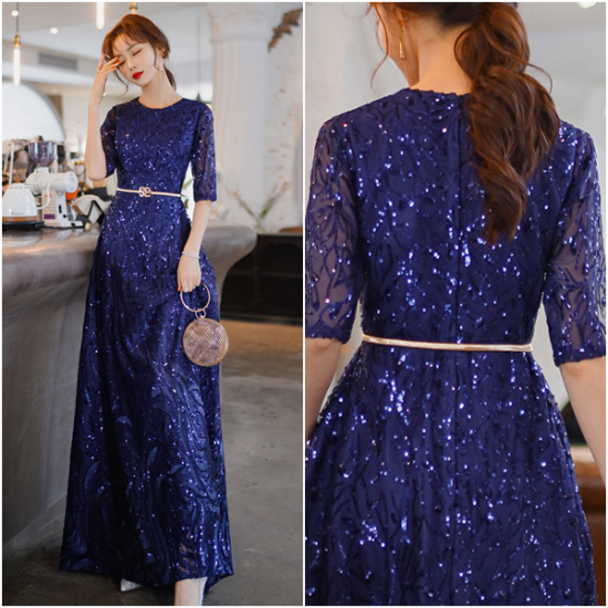 ドレス グロッシー ボタニカル柄 5分袖 ロング 2色 ハイウエスト スタイルアップ 上品 ゴージャス 結婚式 二次会 お呼ばれ