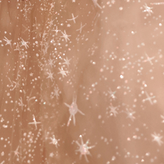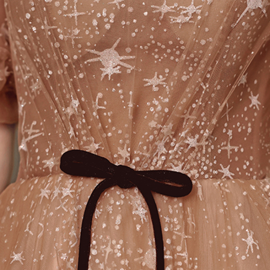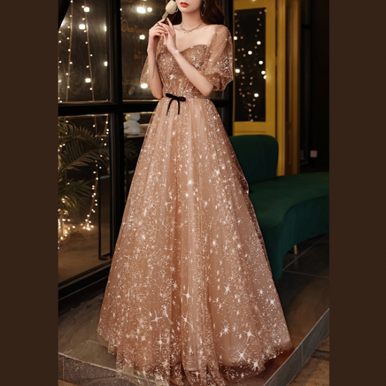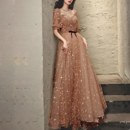 煌めく光模様のオーガンジーが美しい、ハートネックロングドレスです。