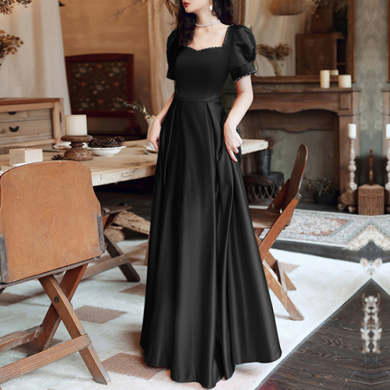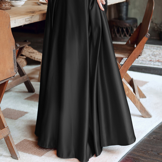 サテンのなめらかな光沢が高貴さを漂わせる、Aラインロングドレス。