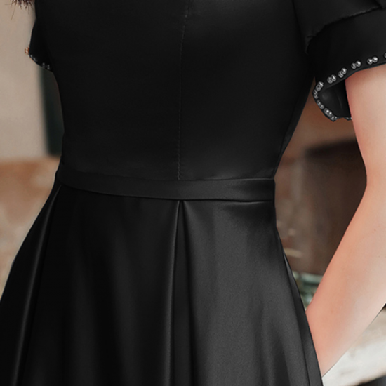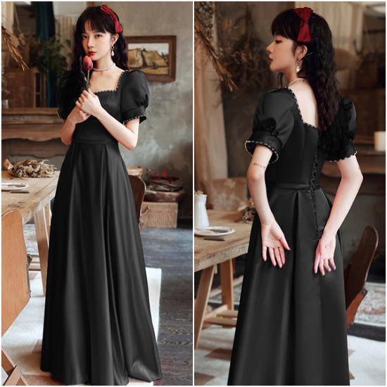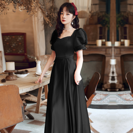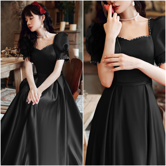 ドレス サテン 光沢 高貴 Aライン ボリュームスリーブ パール 背面レースアップ クラス感 結婚式 二次会 お呼ばれ