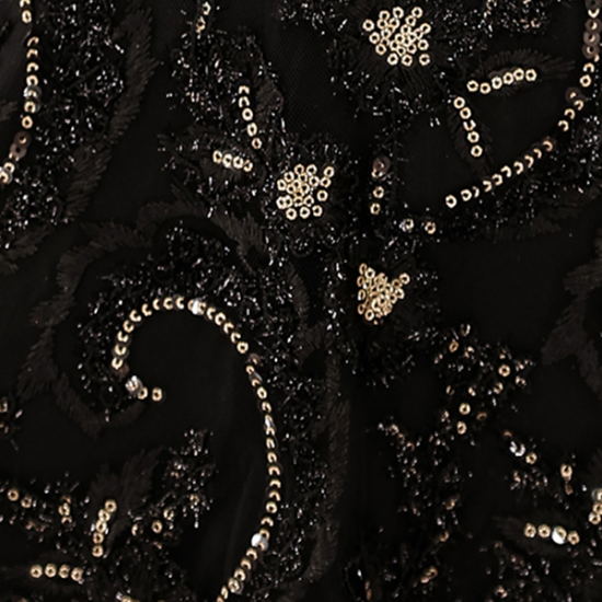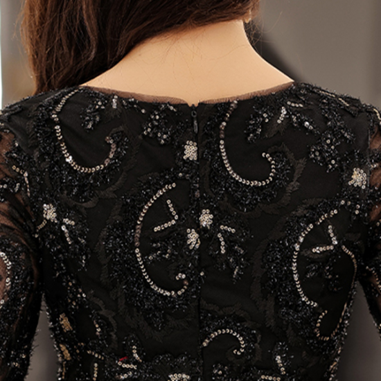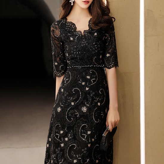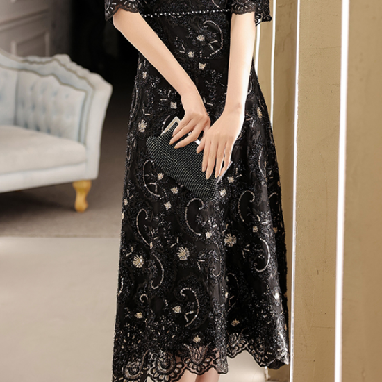 金色のスパンコールで描いた曲線がエレガントな、総レースミモレ丈ドレス。