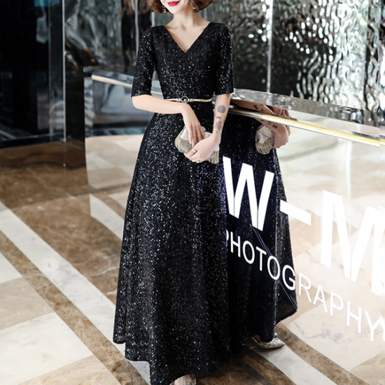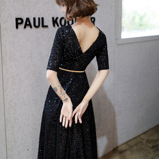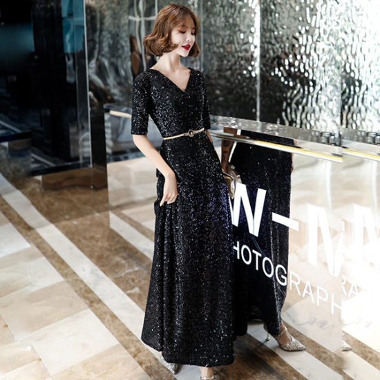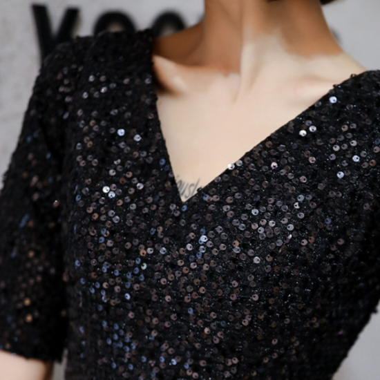 スパンコールで埋め尽くされた、贅沢な5分袖Vネックドレス。