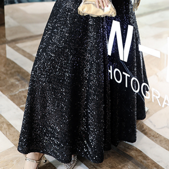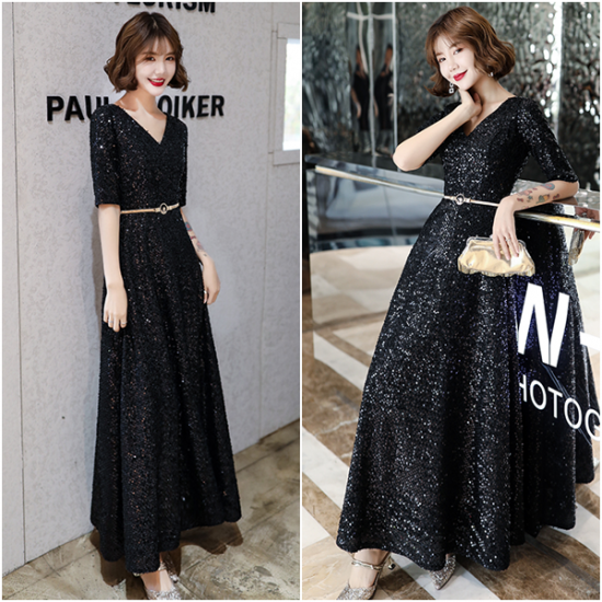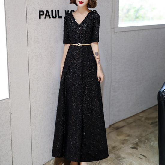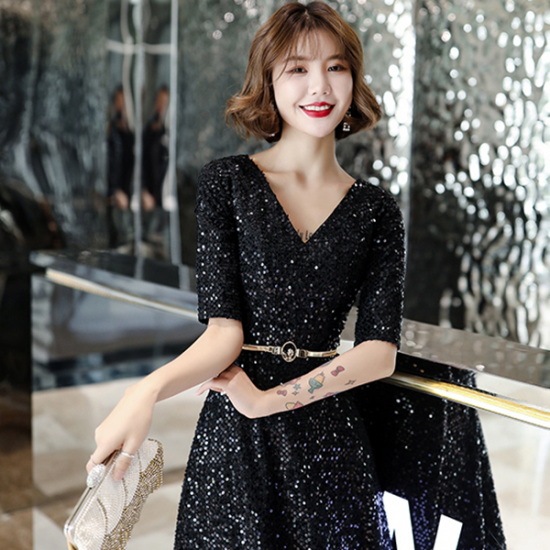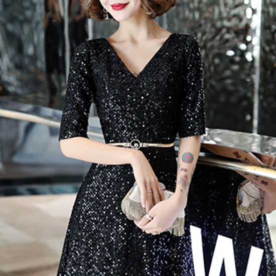 ドレス スパンコール 贅沢 5分袖 Vネック ゴールドベルト スタイルアップ 結婚式 二次会 お呼ばれ