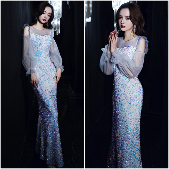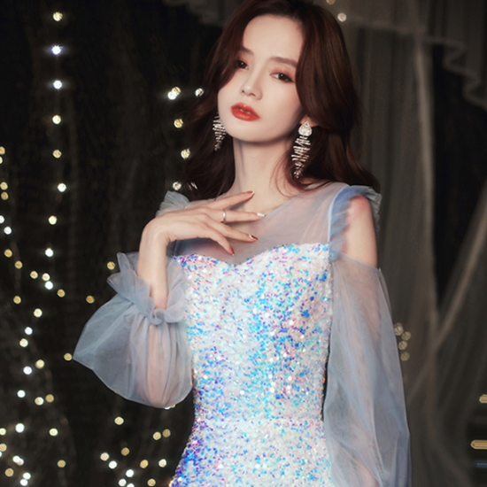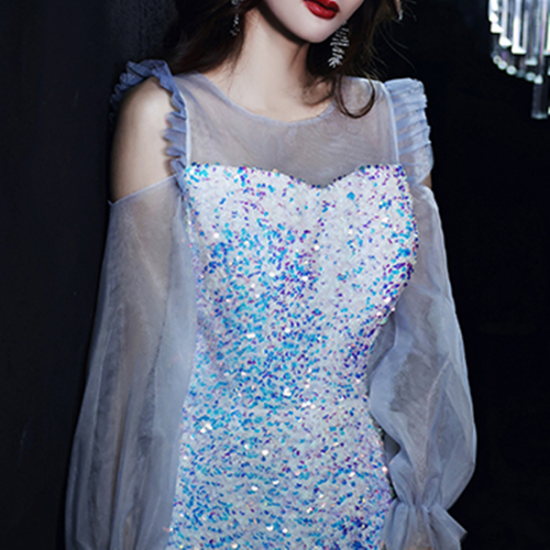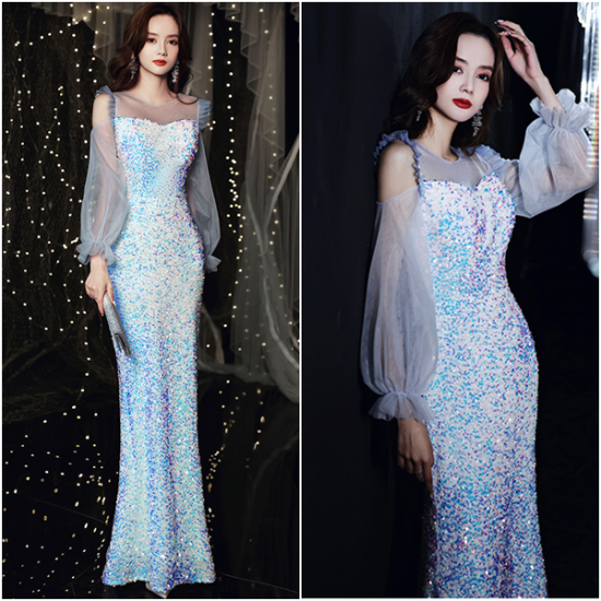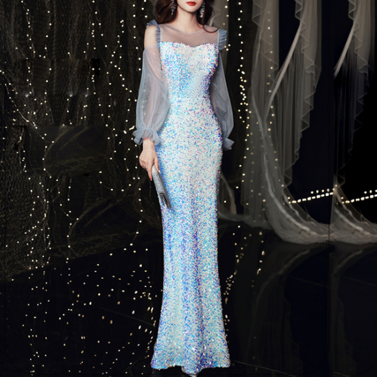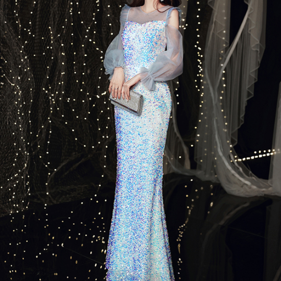 人魚のように虹色にきらめく、ファンタジックなスパンコールのロングドレス。