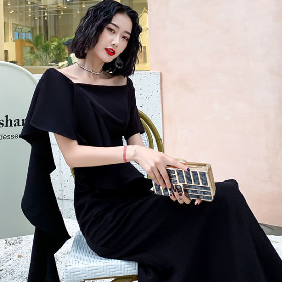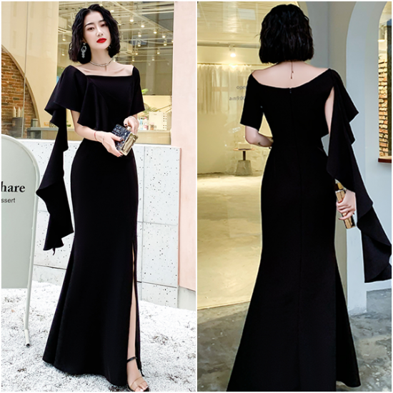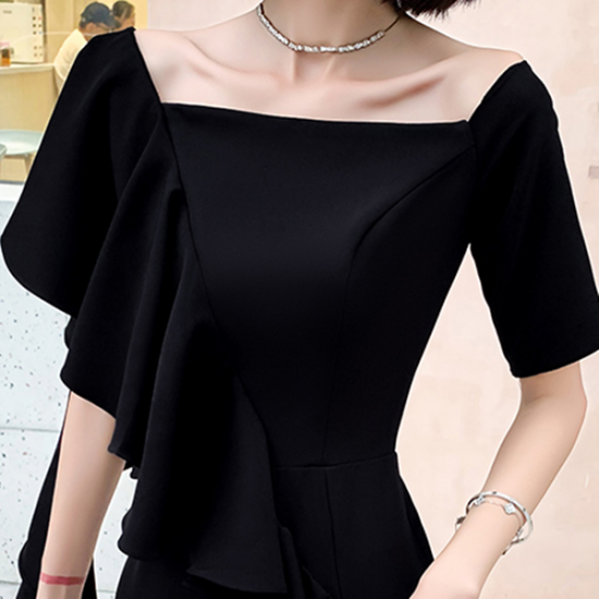 ドレス イレギュラー ラッフル 縦ライン スリム マーメイド スクエアネック ロングスリット 大人 ドレッシー 特別 結婚式 二次会 お呼ばれ