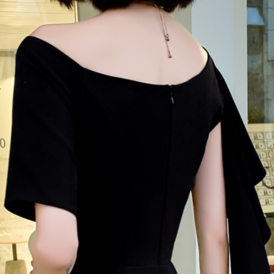 デコルテが映えるスクエアネックと、ロングスリットに大人の魅力が香ります。