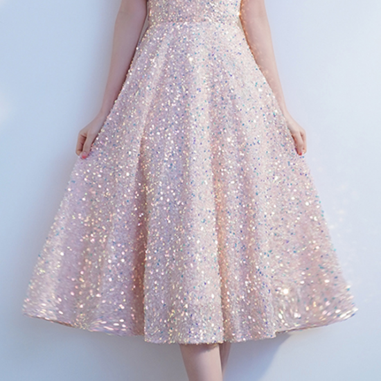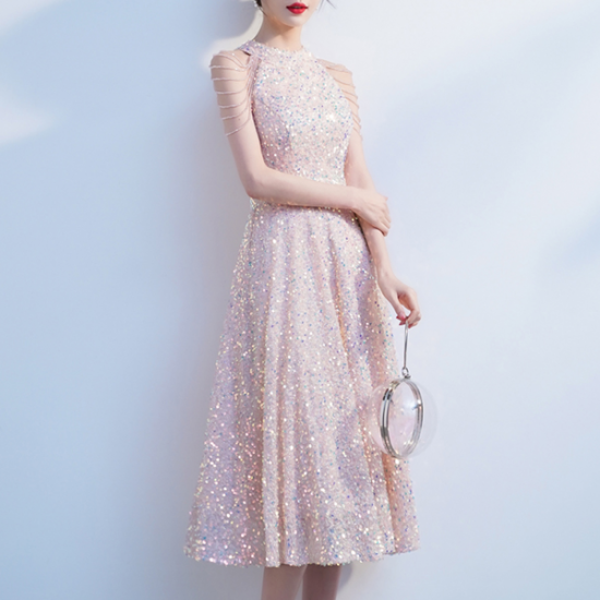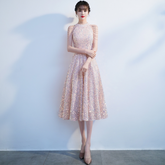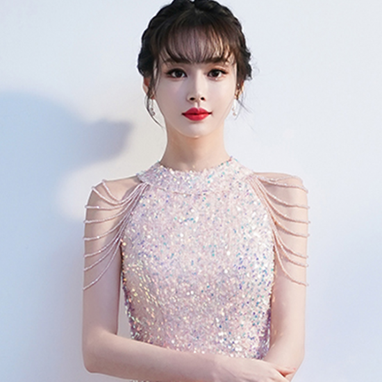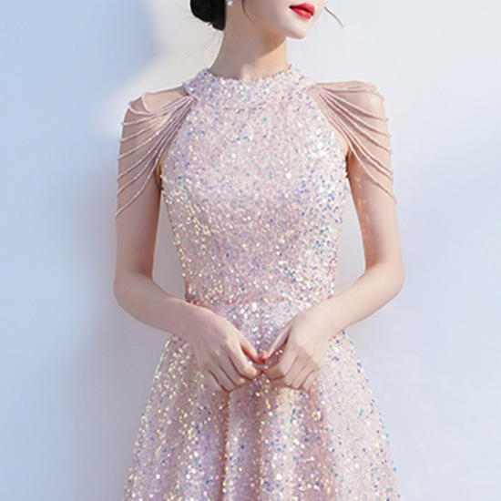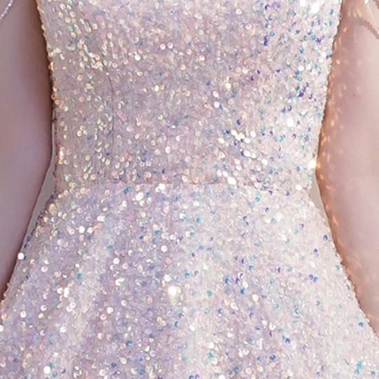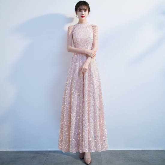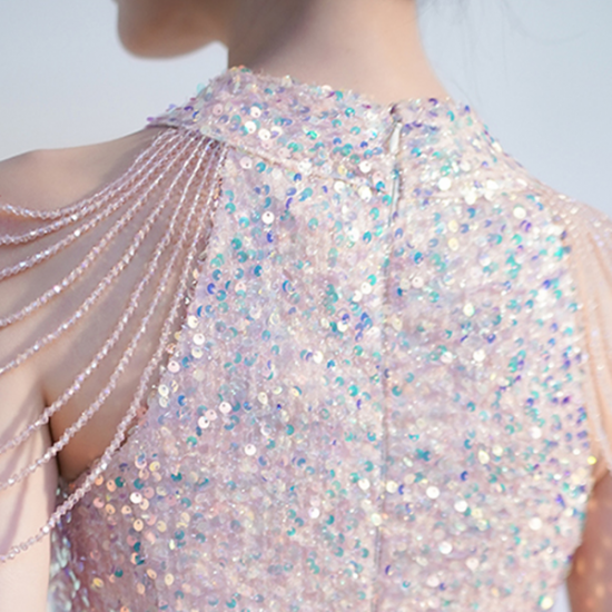 ペールピンクに複雑に輝くスパンコールを散りばめた、美麗なドレスです。