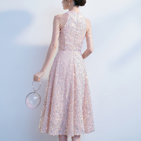 ドレス ペールピンク スパンコール 美麗 着やせ アメリカンスリーブ ビーズフリンジ 煌めき 大人フェミニン 結婚式 二次会 お呼ばれ