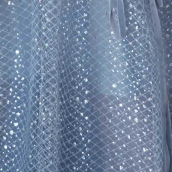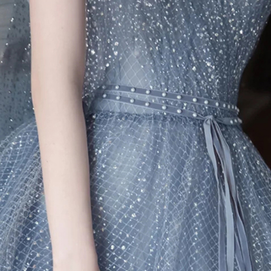 星屑のように煌めくくすみブルーのイブニングドレスは、