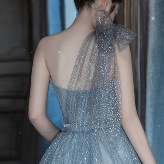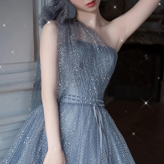 ドレス 星屑 くすみブルー イブニングドレス ふんわりメッシュ ワンショルダー フレア クラス感 主人公 逸品 結婚式 二次会 お呼ばれ