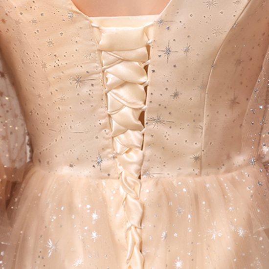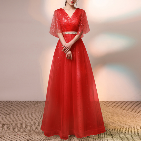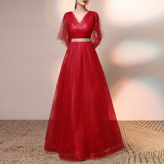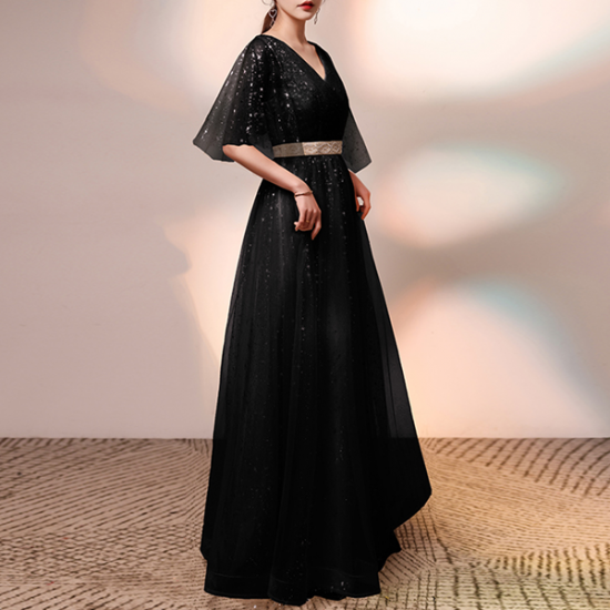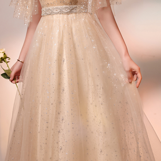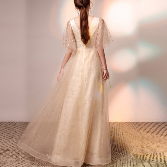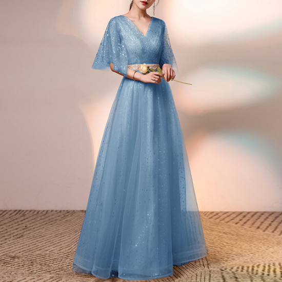 シースルー素材できれい見えするフレアスリーブロングドレスです。