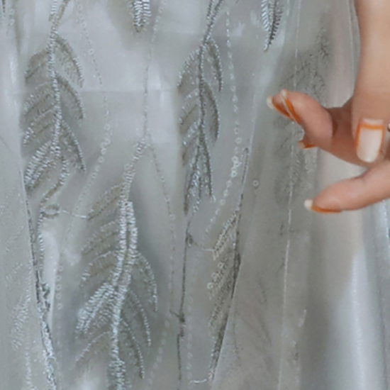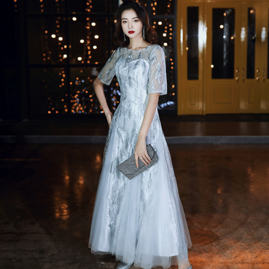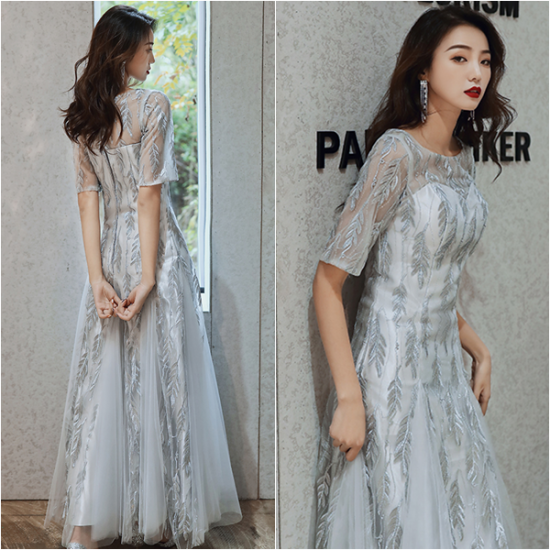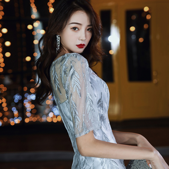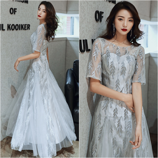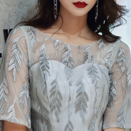 ドレス シースルー リーフ模様 刺繍 エアリー スタイリッシュ シルバーグレー ふわり裾 印象的 結婚式 二次会 お呼ばれ