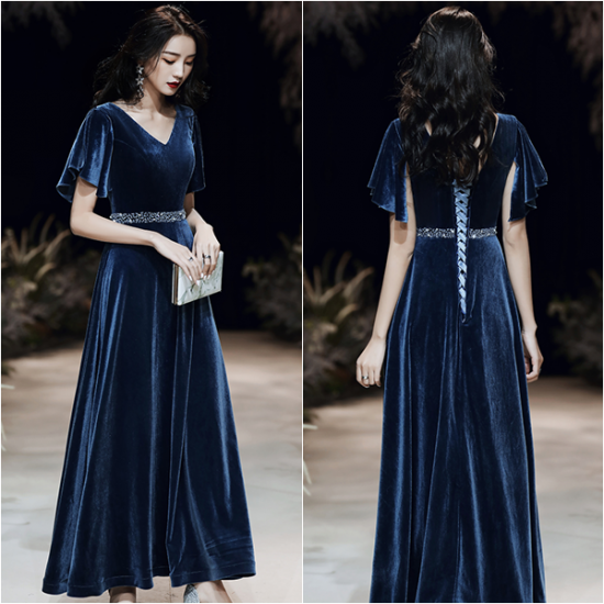 ドレス ベルベット 艶っぽ シック フレアスリーブ スパンコール 華やぎ 7分袖 クラシカル フォーマル 結婚式 二次会 お呼ばれ