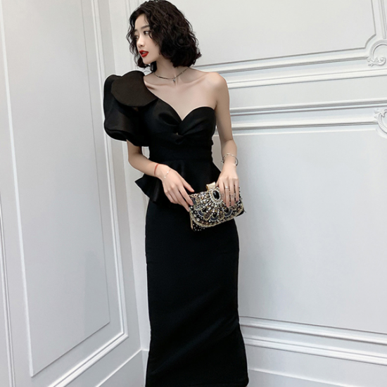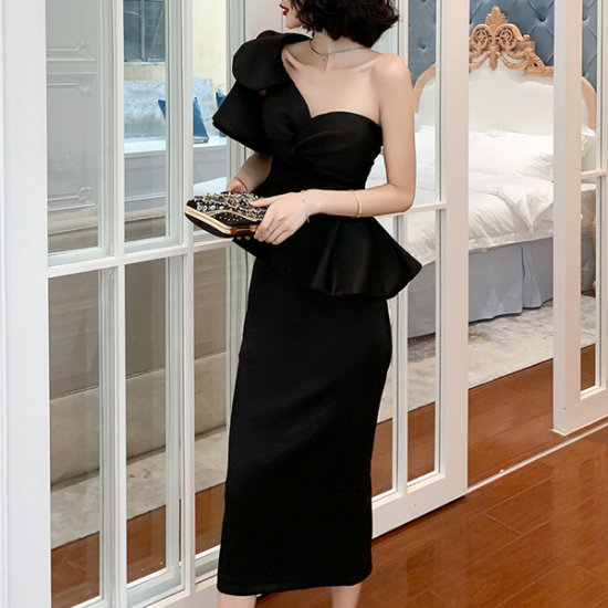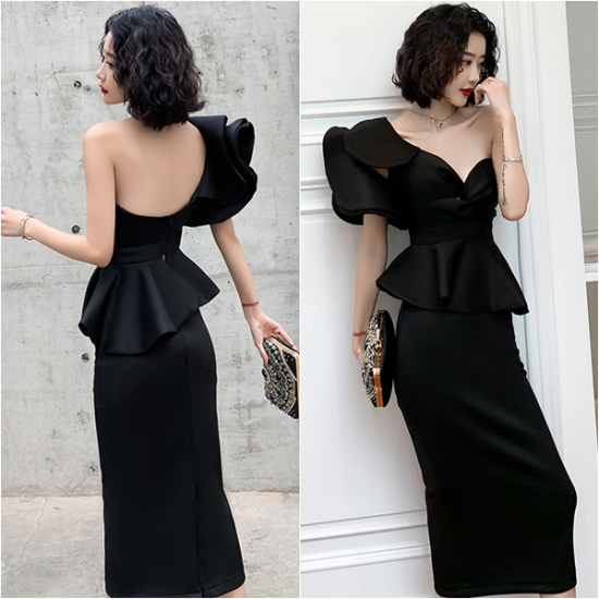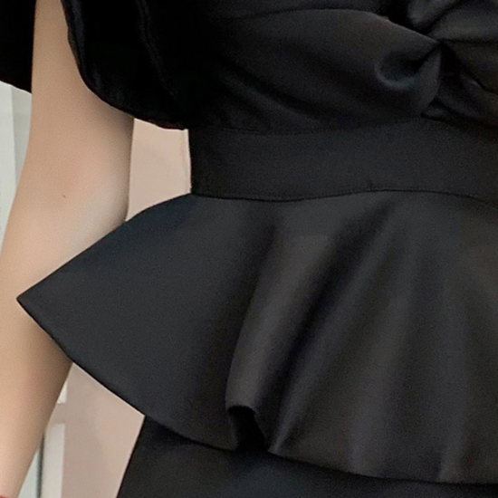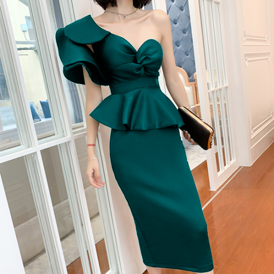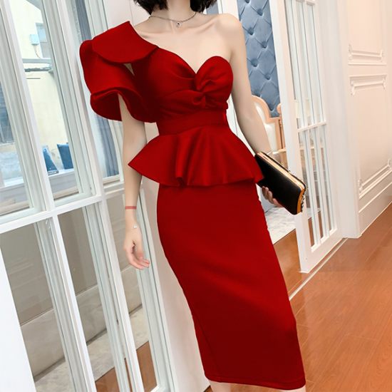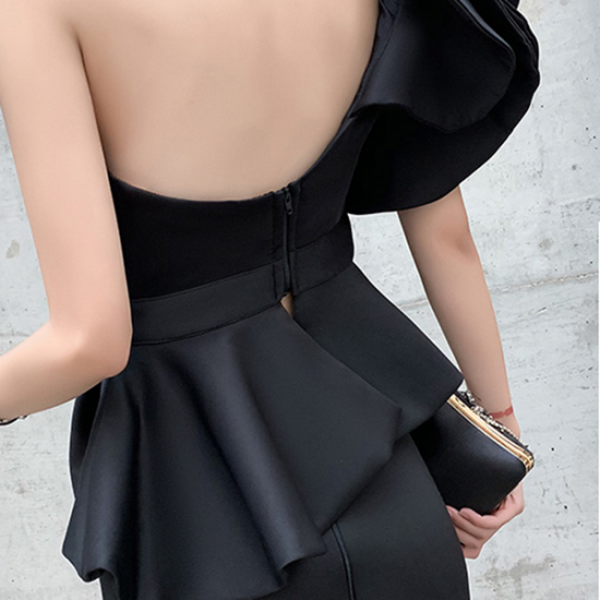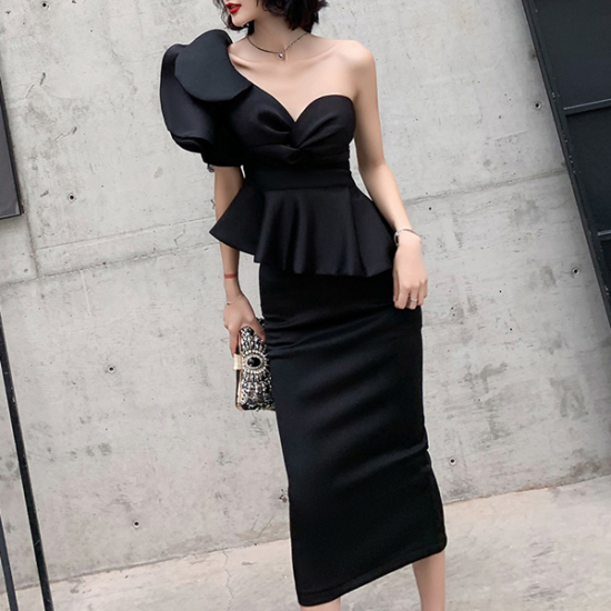 ドレス 女優 オーラ モード ツーピースドレス アシンメトリー フリル 魅惑的 ボディライン 存在感 逸品 結婚式 二次会 お呼ばれ