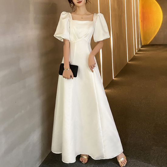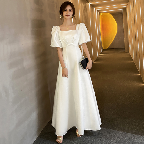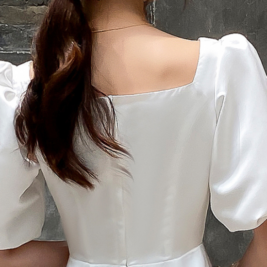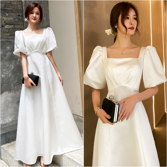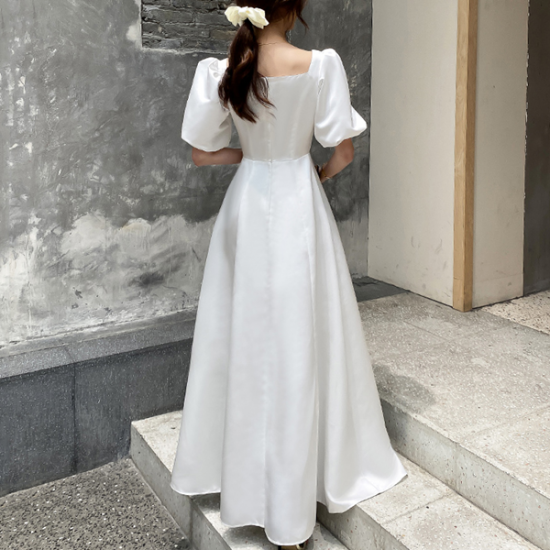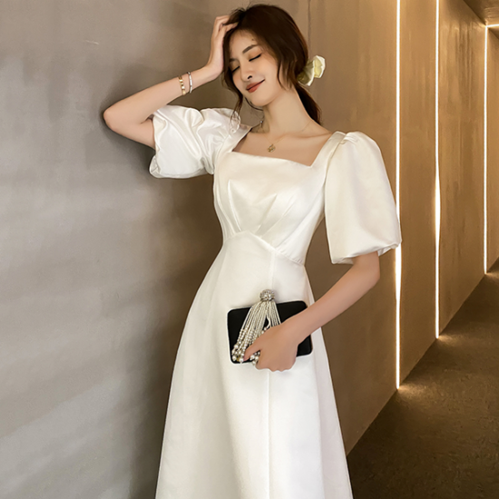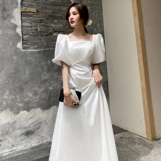 ドレス 清純 白 Aライン エレガント スクエアネック ランタンスリーブ 可愛げ 腰高 スタイルアップ パーティー 結婚式 二次会 お呼ばれ
