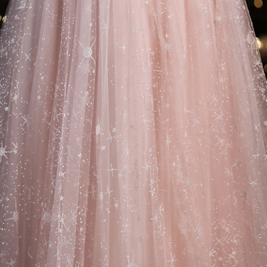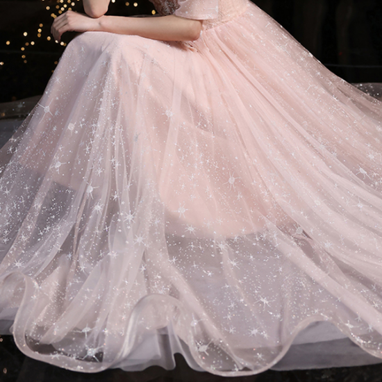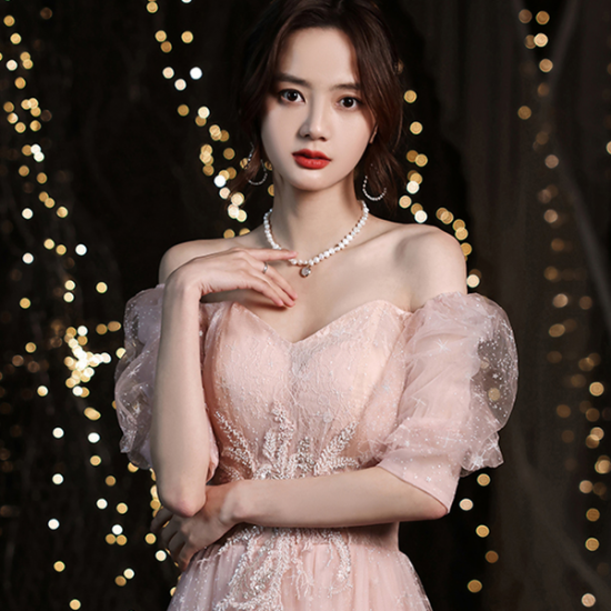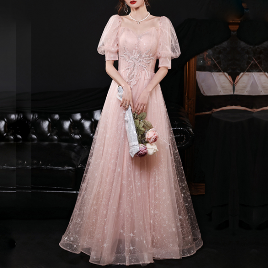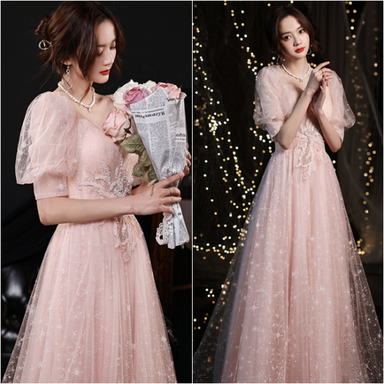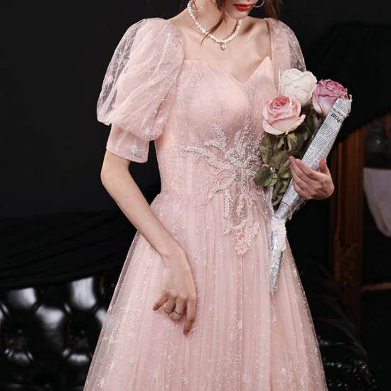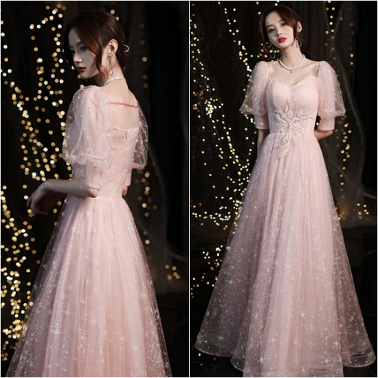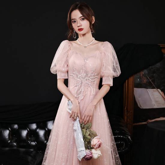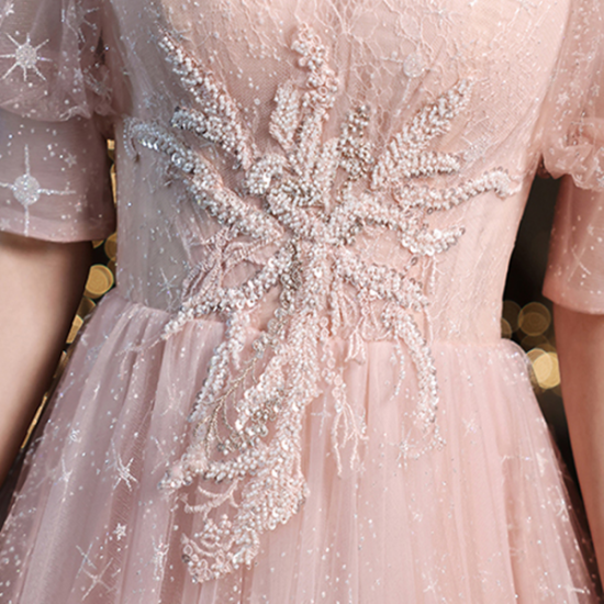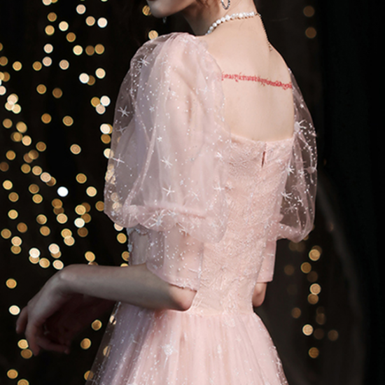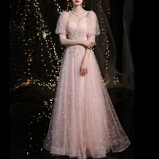 優しげなピンクにシルバーラメが煌めく、ランタンスリーブロングドレス。