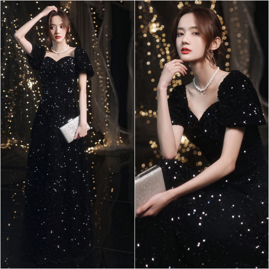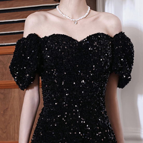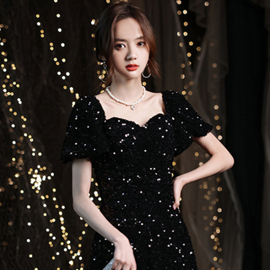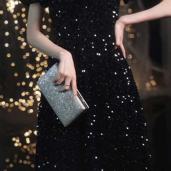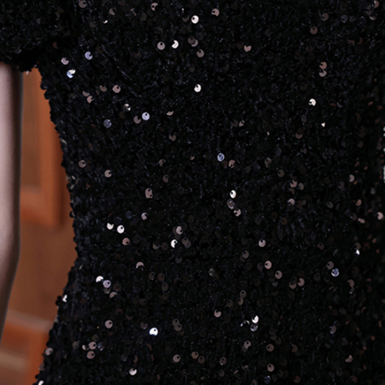 煌びやかなスパンコールを敷き詰めたラグジュアリーなイブニングドレス。