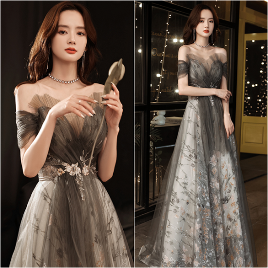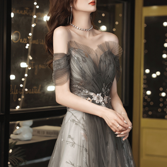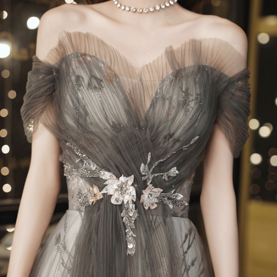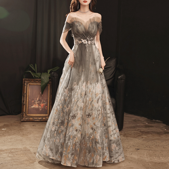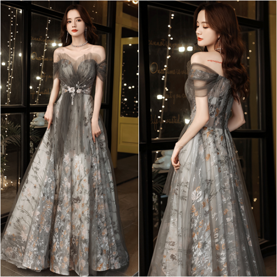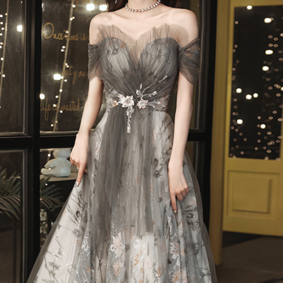 繊細な花柄ラメプリントにグレーのオーガンジーを合わせた、