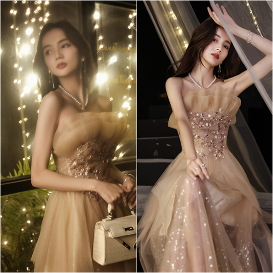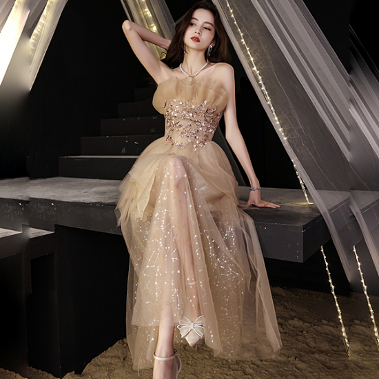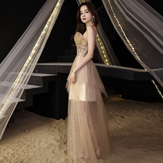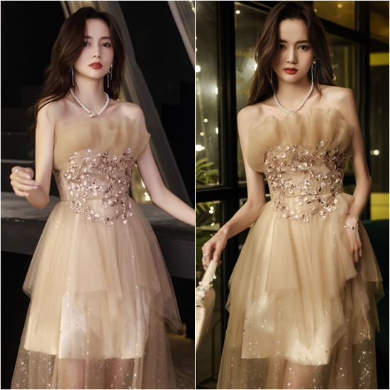 ドレス オーガンジー フリル ロング丈 ベアトップ ハートモチーフ スパンコール 煌びやか 星柄チュール 綺麗 透け感 結婚式 二次会 お呼ばれ