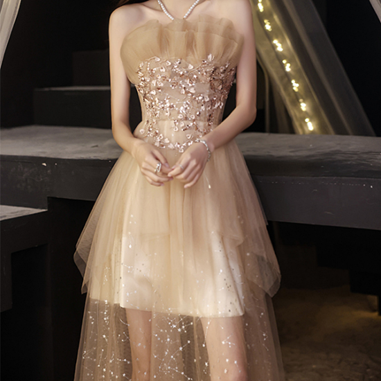 ベアトップにハートモチーフやスパンコールをあしらい、煌びやかなアクセントに。