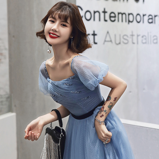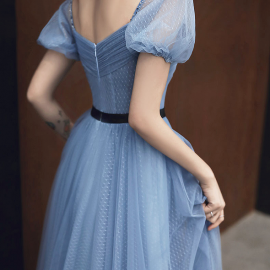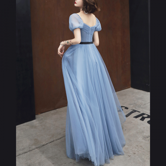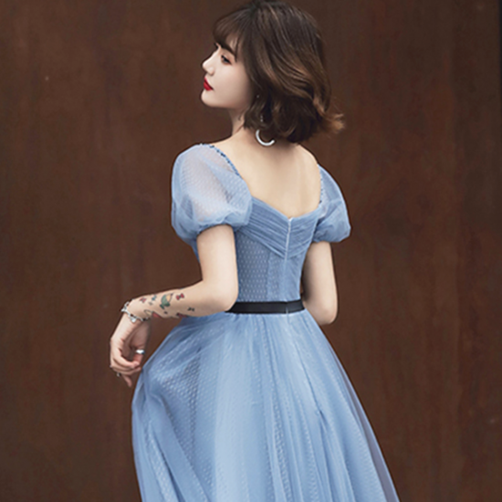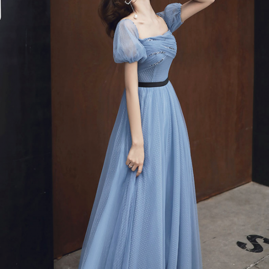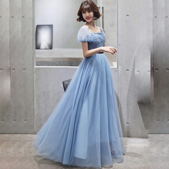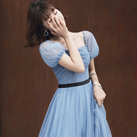 ドレス メッシュ 透明感 ブルー パフスリーブ ロング スクエアカラー レディ ふんわりフレア ブラックライン スタイルアップ 結婚式 二次会 お呼ばれ
