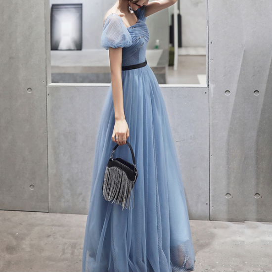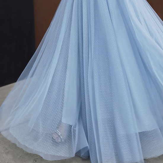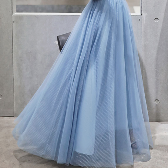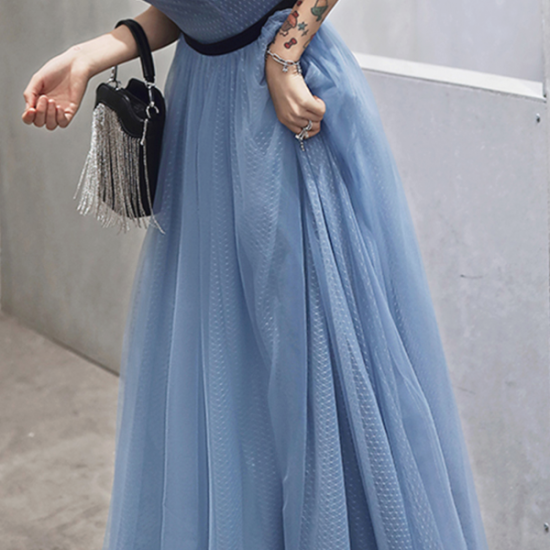 ホワイトのメッシュに透明感あふれるブルーを重ねた、パフスリーブロングドレス。