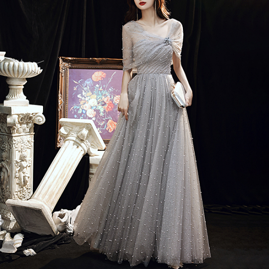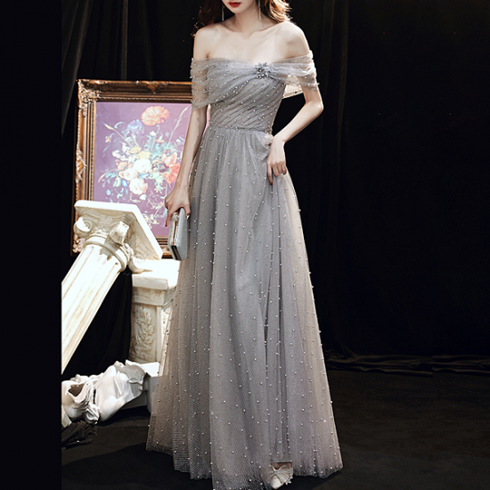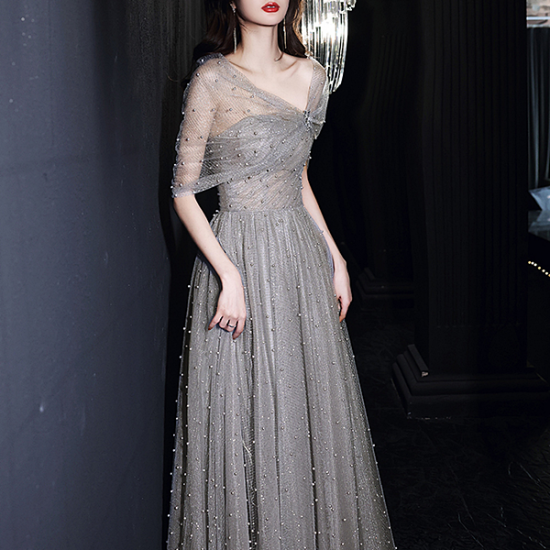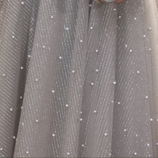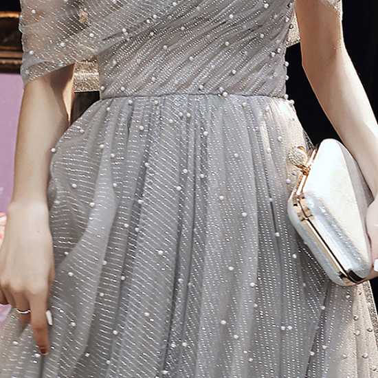 パールを散りばめたメッシュでしとやかに装うイブニングドレス。