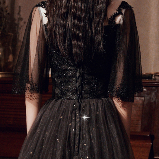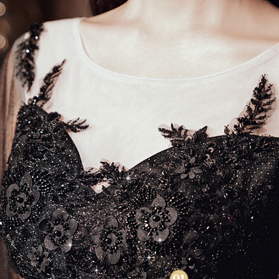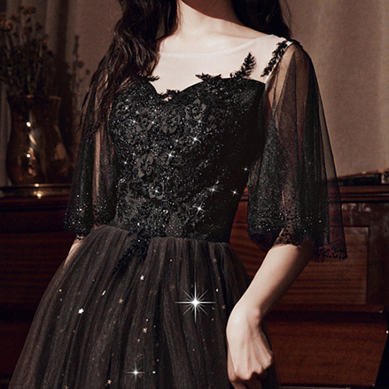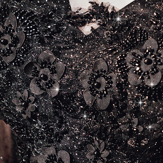 フラワーモチーフにビーズ刺繍を重ね、シアースリーブで色香をプラス。