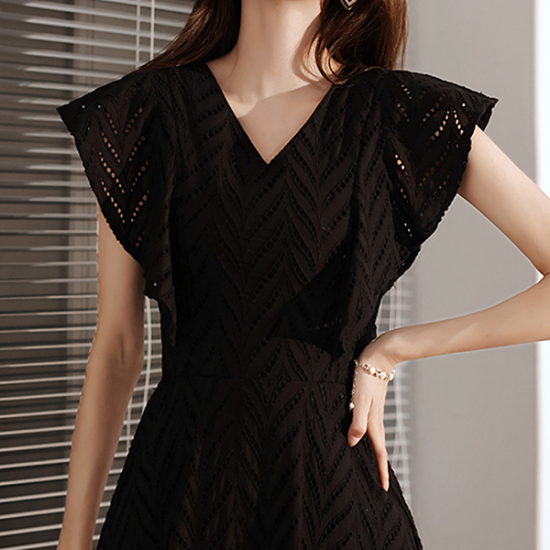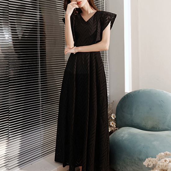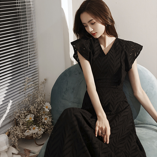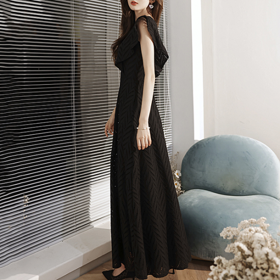 豊かな表情を見せるボーラーレースで仕立てた、ブラックのロングドレス。