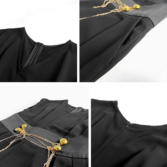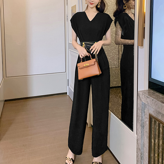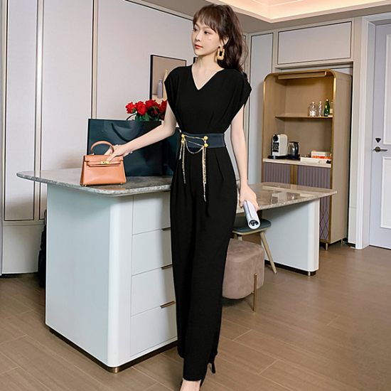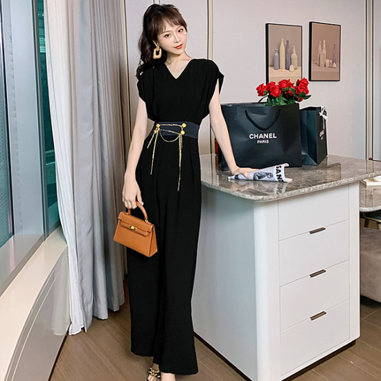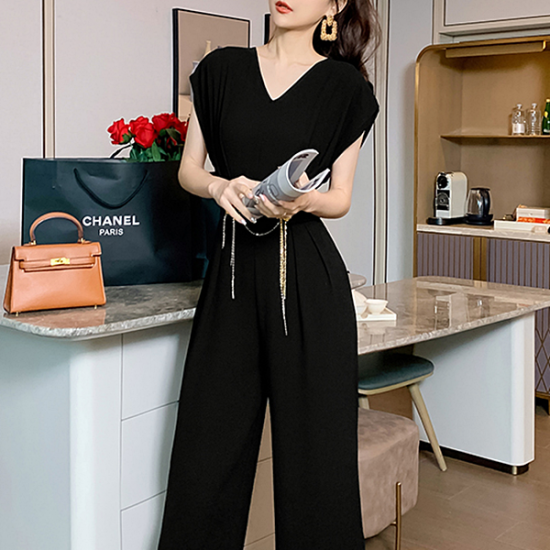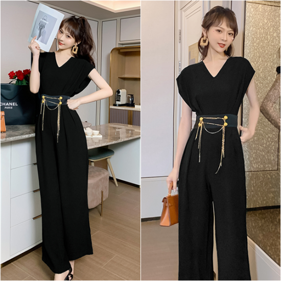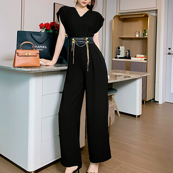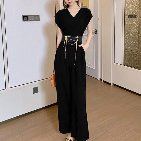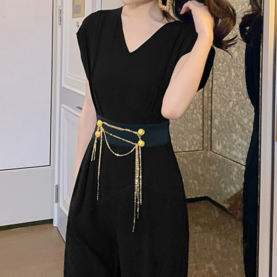 ドレス ゴールドチェーン 高級感 エッジ ワイドパンツドレス Vネック フレンチスリーブ 抜け感 オケージョン 日常 着回し 結婚式 二次会 お呼ばれ