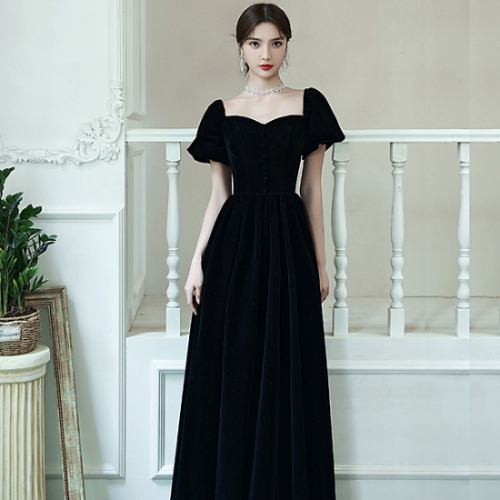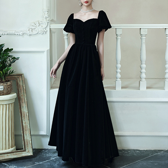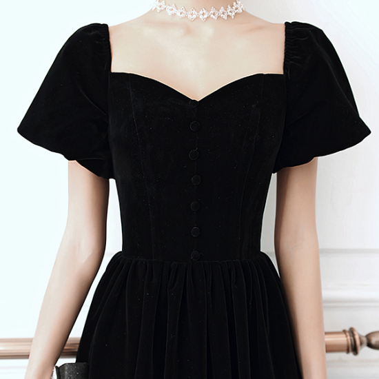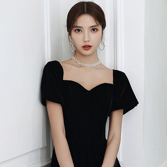 ドレス ベルベット ランタンスリーブ ハートネック ノーブル ウエストシェイプ スタイルアップ 結婚式 二次会 お呼ばれ