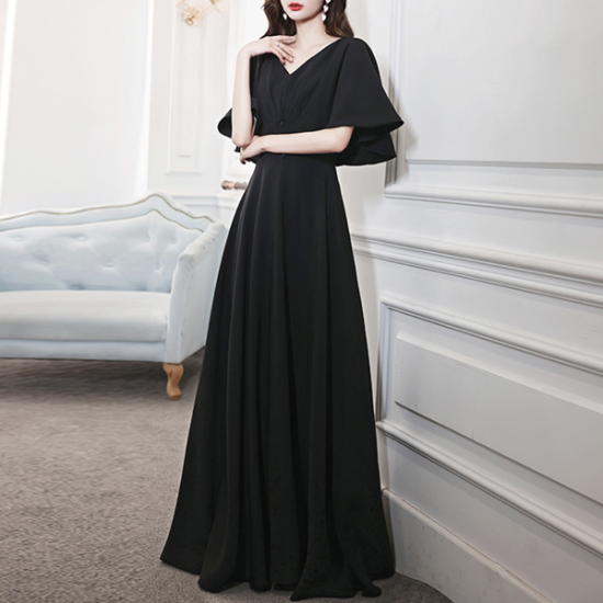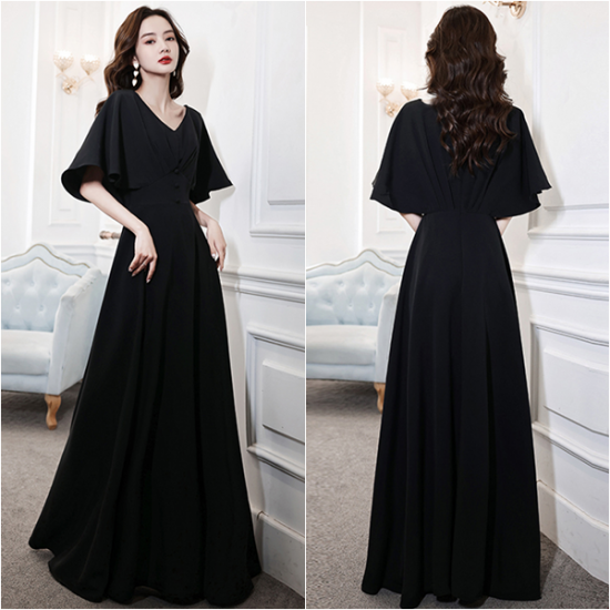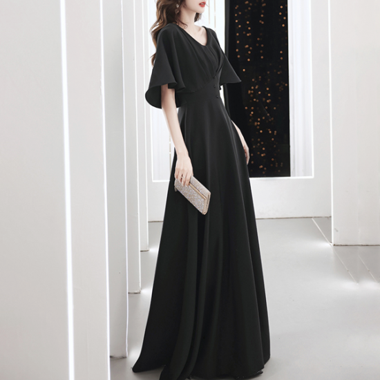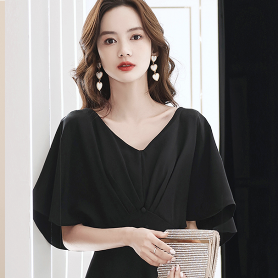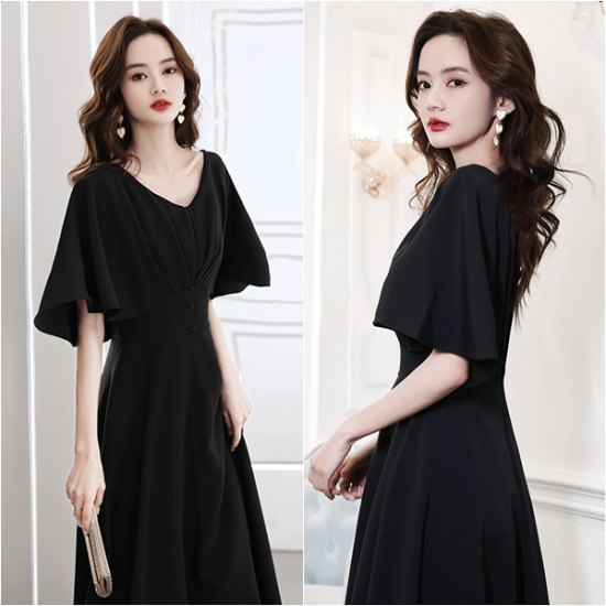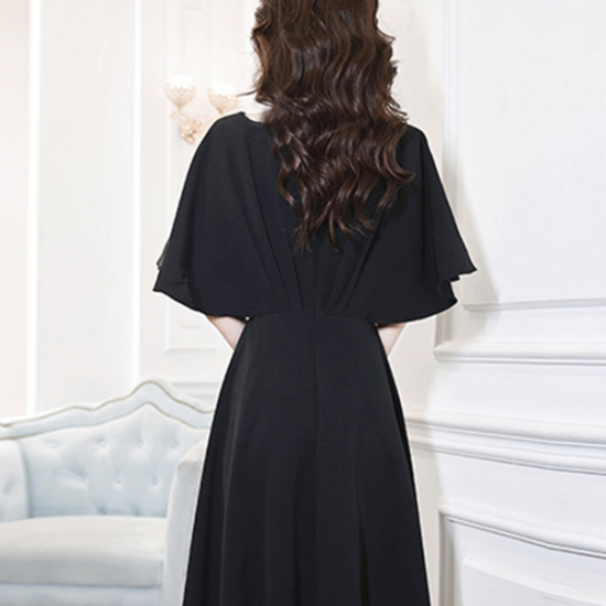 二の腕をスリムに見せるフレアスリーブが嬉しい、ブラックドレス。