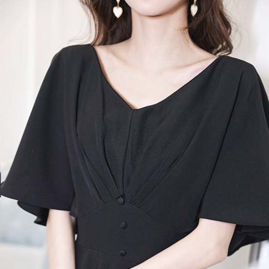 ドレス 二の腕カバー フレアスリーブ ブラックドレス プリーツ ボタン遣い きちんと感 女らしさ 体形カバー 結婚式 二次会 お呼ばれ