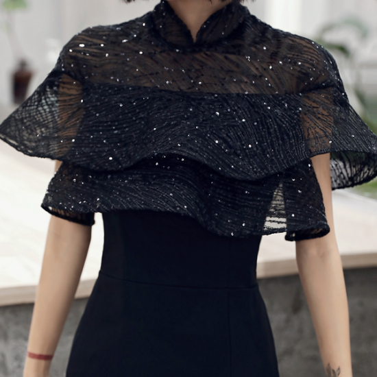 チャイナ風ネックラインに煌めくフリルを纏わせた、