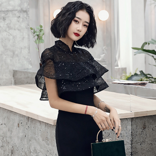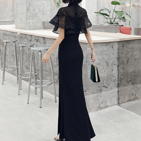 ドレス チャイナ風 煌めき フリル ブラック Iライン ロングスリット 艶っぽ 美シルエット 結婚式 二次会 お呼ばれ