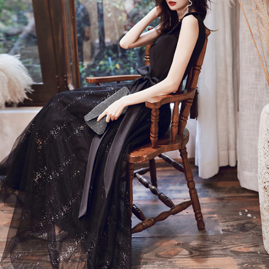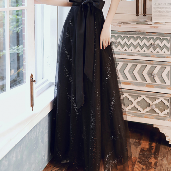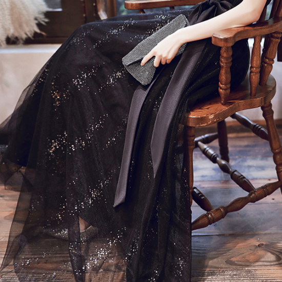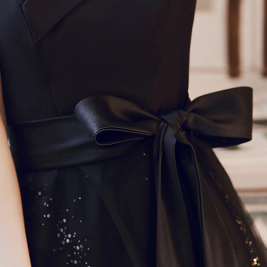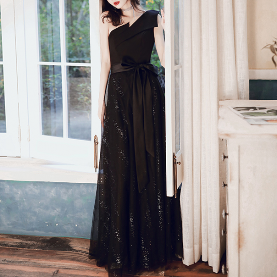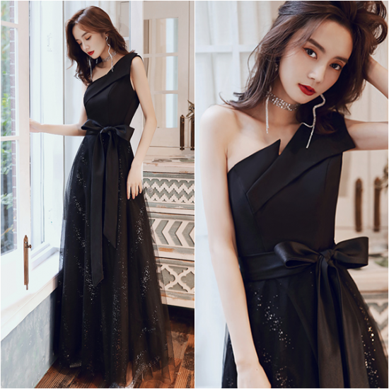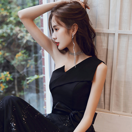 ワンショルダーとシャープなネックラインが大人に似合うブラックドレス。