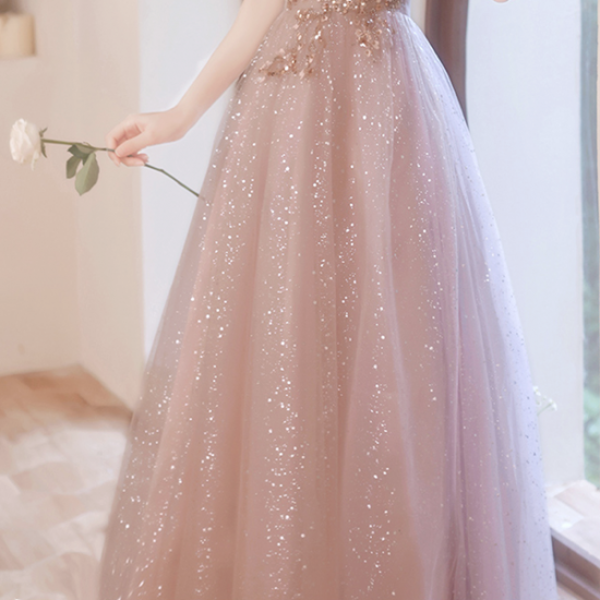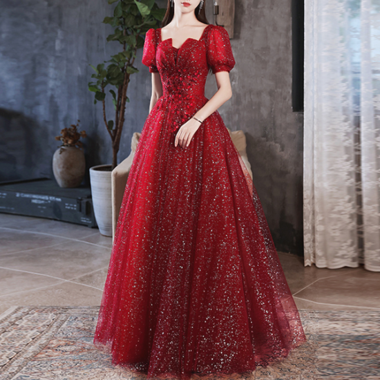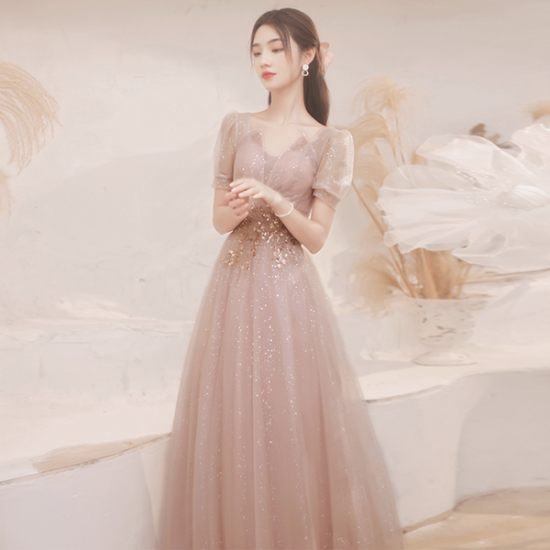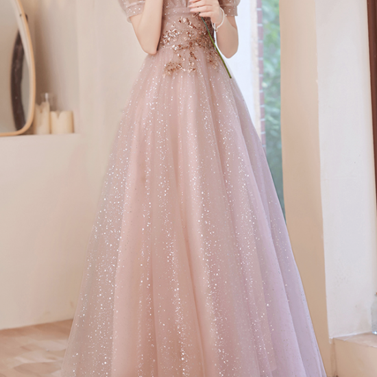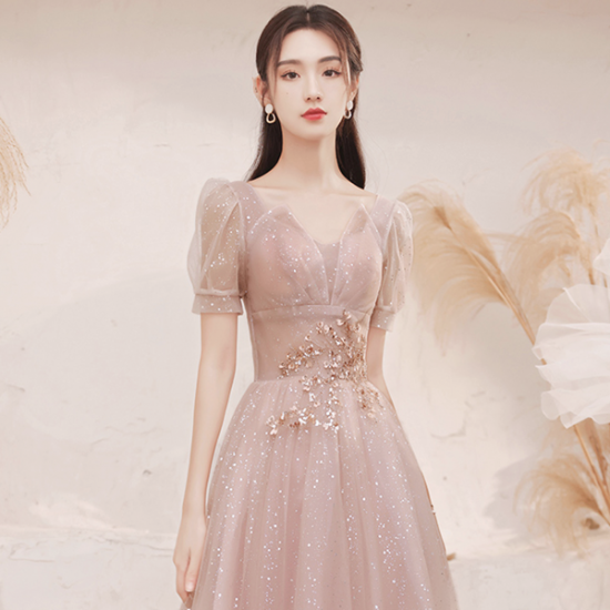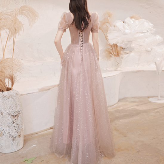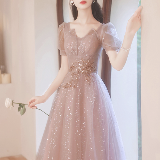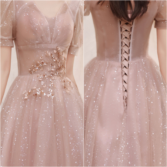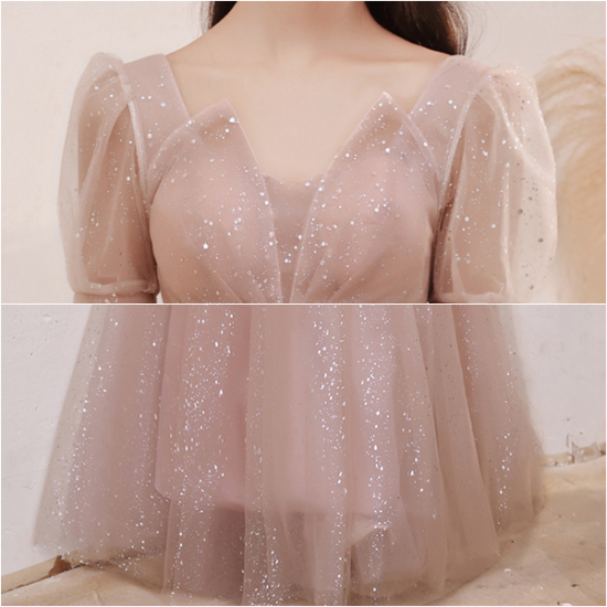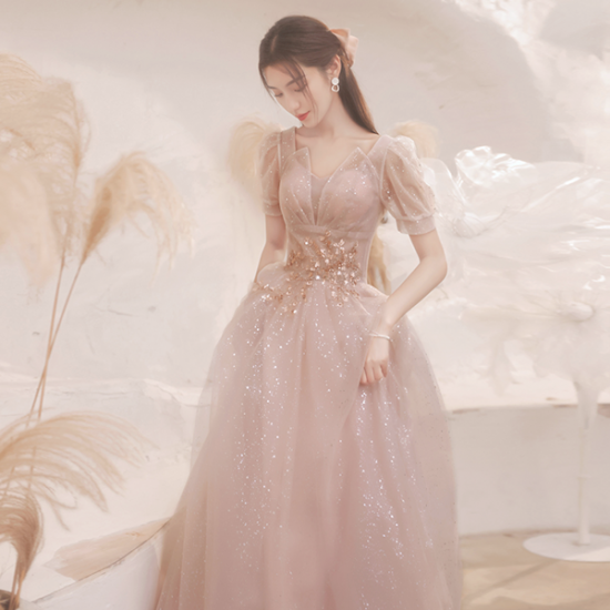 ドレス プリンセス 高貴 パフスリーブ シースルー素材 ラメプリント 煌めき ほの甘 Aライン 美シルエット 結婚式 二次会 お呼ばれ