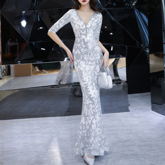 ドレス 煌めき ダマスク文様 エキゾチック 5分袖 マーメイド セクシー 深Vネック シアー バックスタイル 色気 大人 絵になる パーティー 結婚式 二次会 お呼ばれ