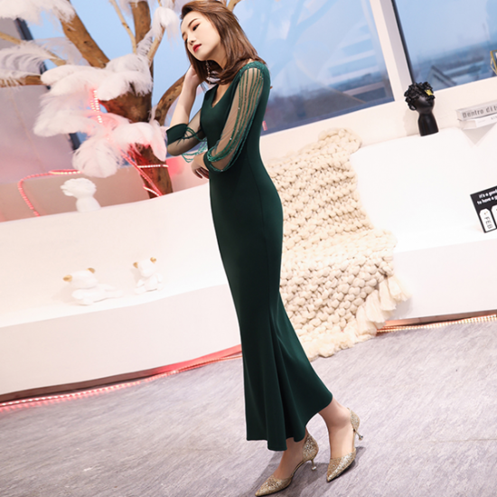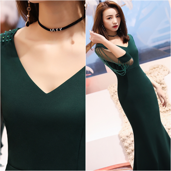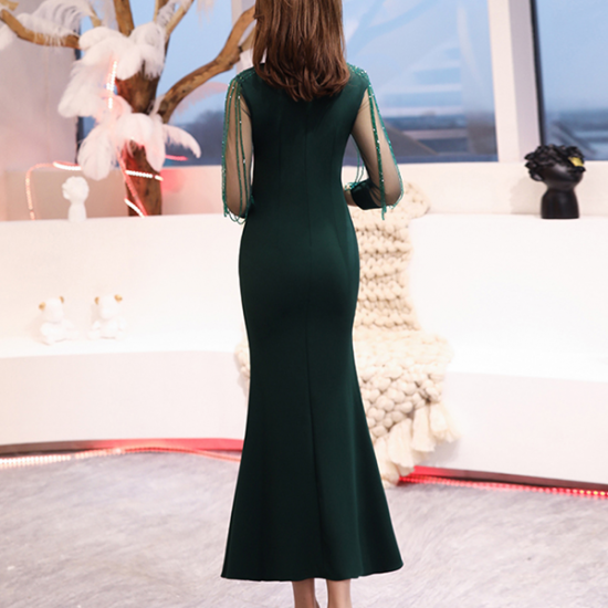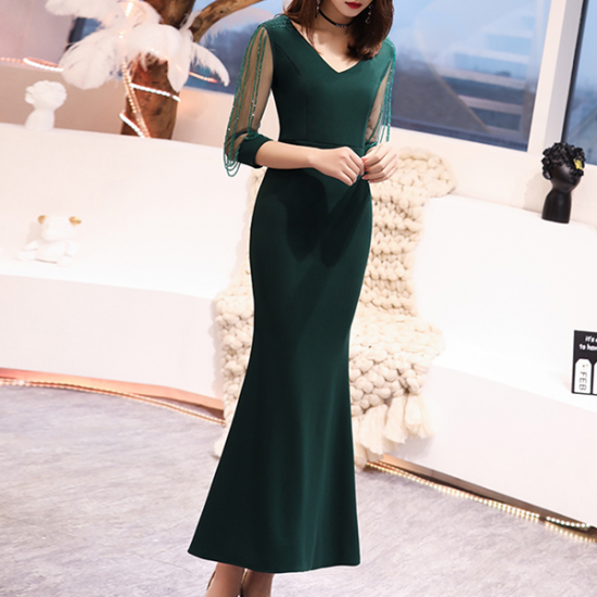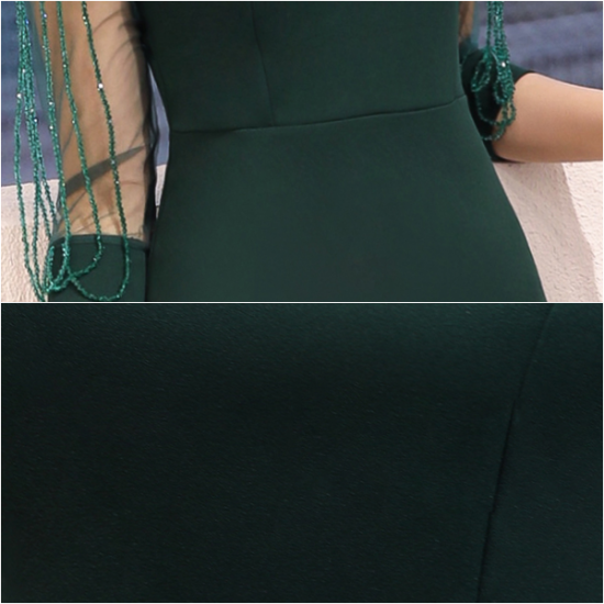 ドレス シアースリーブ ビーズフリンジ シック 上品シンプル ストレッチ 着心地良 Vネック マーメイドライン 女らしさ センス良 結婚式 二次会 お呼ばれ