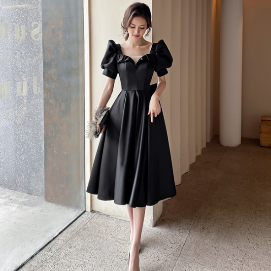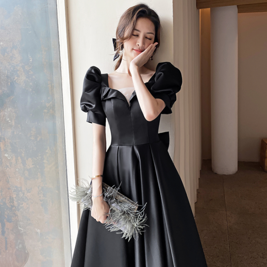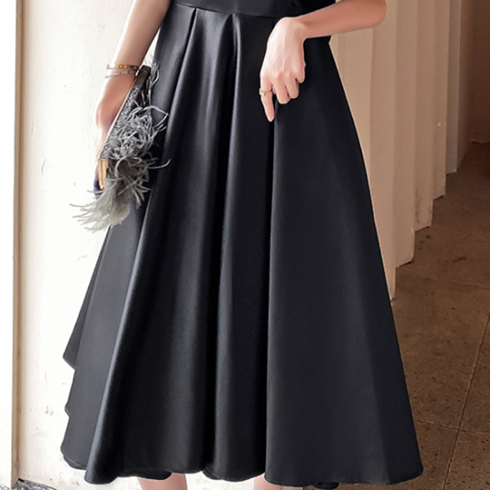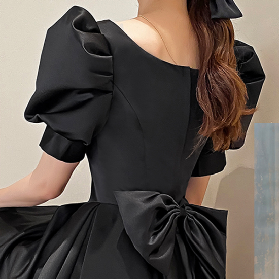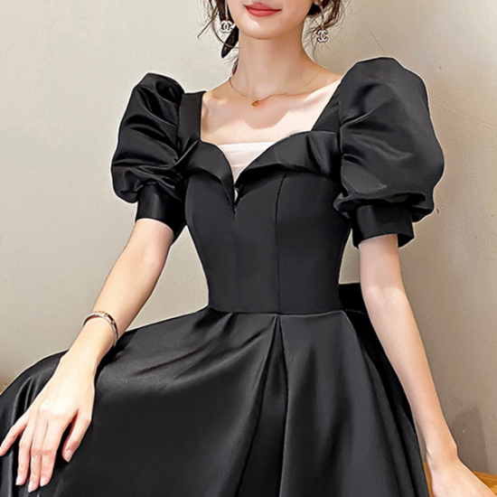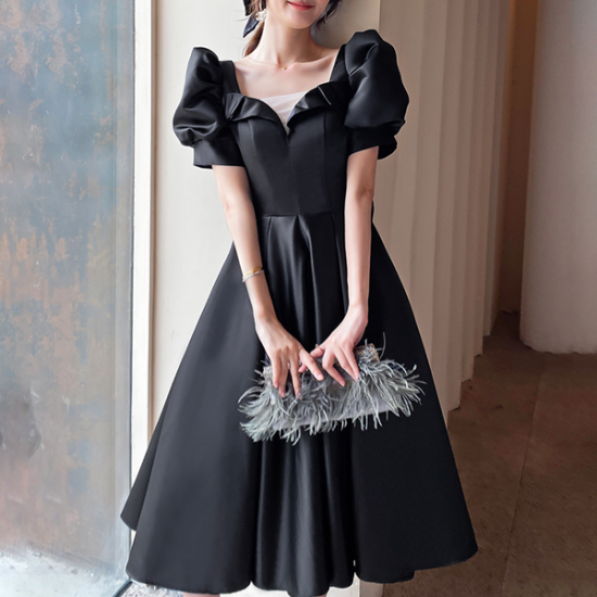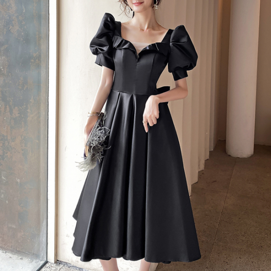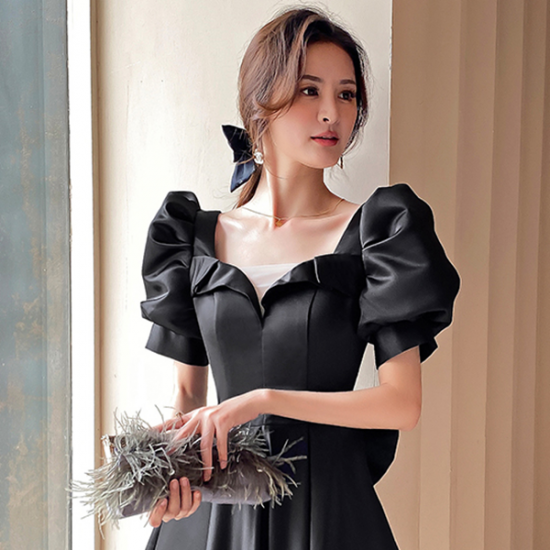 ドレス 綺麗見え サテン Aライン ボリュームスリーブ 変形ネックライン ウエストシェイプ たっぷりフレア 完成度 結婚式 二次会 お呼ばれ