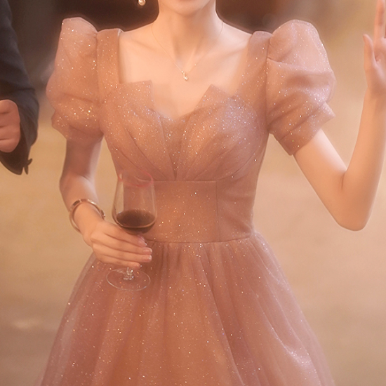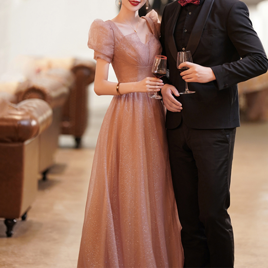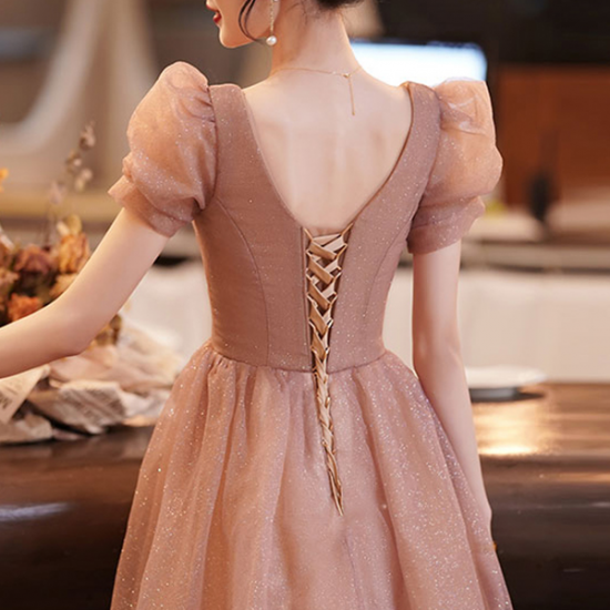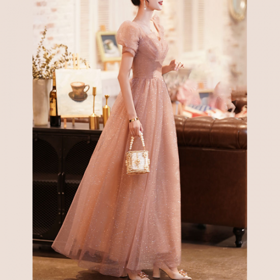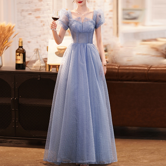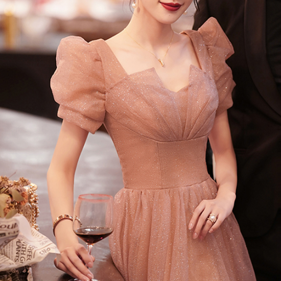 ドレス 上品ラメ ワントーン ロング丈 パフスリーブ 優雅 フレア 女性らしい コルセット風切替 細見え 背面レースアップ レディ 結婚式 二次会 お呼ばれ